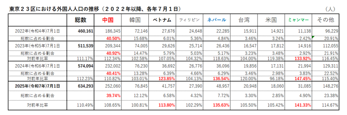 ■また江戸川区と新宿区は、2025年7月、外国人人口が初めて5万人を超えました。