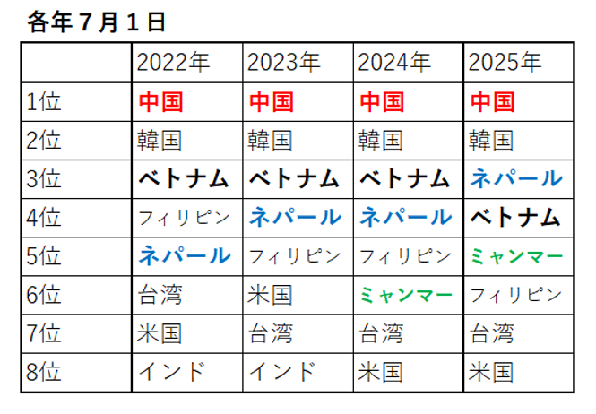 ■一方、増加率の上昇が著しいのは、昨年もそうだったわけですが、ネパールとミャンマー、この2つの国が群を抜いています。順位を具体的に見ると、以下のように、直近ではネパールは3位、ミャンマーは5位と、前年からランクを上げています。