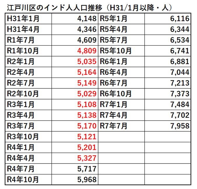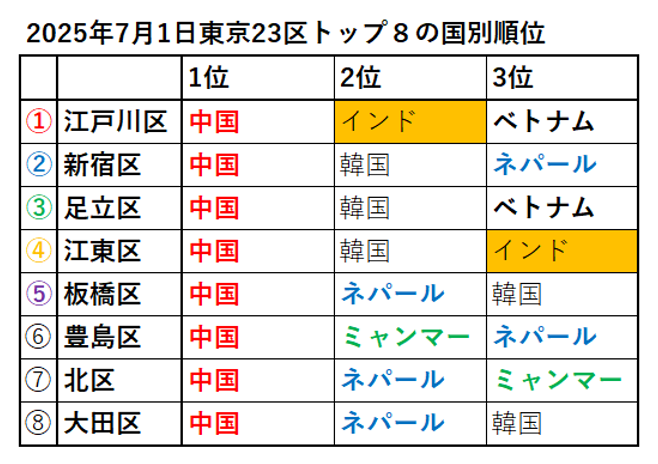 ■インド人人口は、23区全体でも、ランキング表では8位までしか載せていませんが、2025年7月は9位となっています。