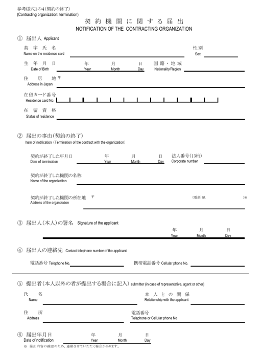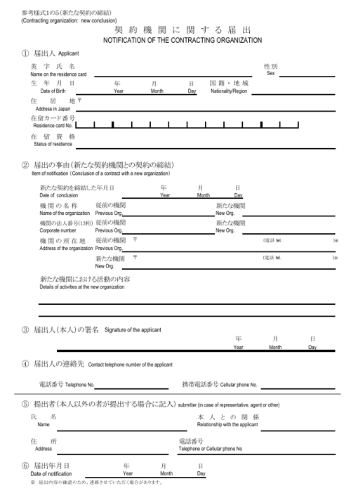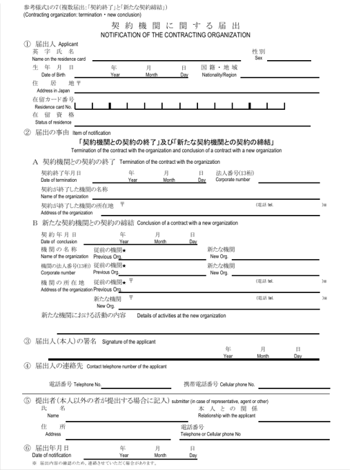 いずれの場合も、重要なことは、退職、再就職の事由が発生したら、その日から14日以内に入管に「契約機関に関する届出」をしなければならないということです入管法の19条の16で定められています)。