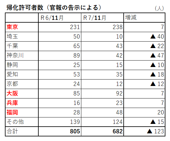 ■これは11月単月の比較なわけですが、どうでしょうか、帰化許可者数は結構、減っています。