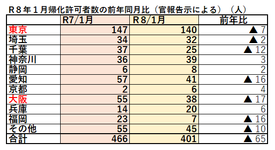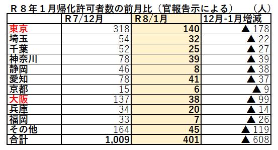 ■R8年1月の帰化許可者数は、R7年12月と比べると、▲608人も減りました。